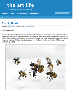 'Mighty Small' was conceptualised after rifling through Brenda May Gallery's archives and finding an invitation to a previous exhibition entitled 'Small' and an image of an art vending machine from the early 1990's made by a group of students. Adopting the tiny scale of 'Small', I curatorially aimed for the works in 'Mighty Small' to not only be little in size, but rely on this scale as an integral part of the work's desired impact. The organisation of the vending machine was definitely a labour of love, inspiring artists to make wonderful miniature works accessible in price and available to be purchased in an exciting and interactive way.